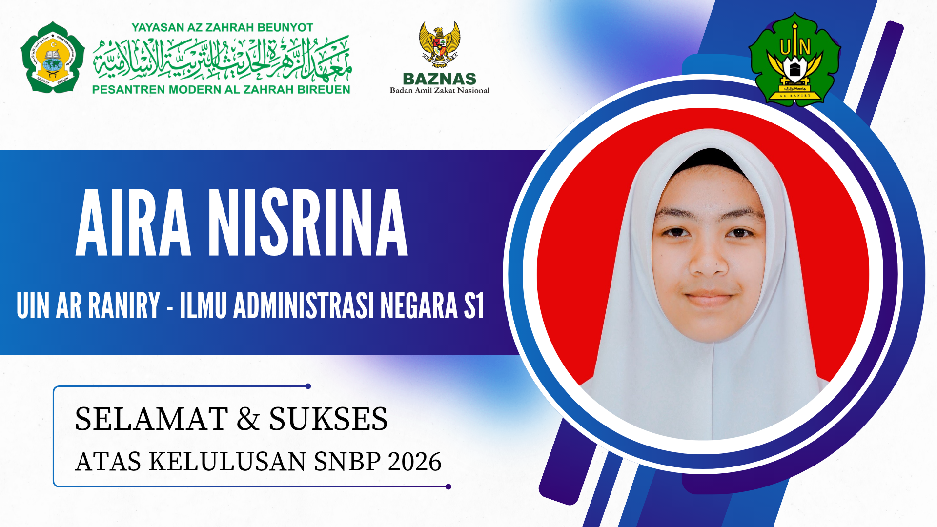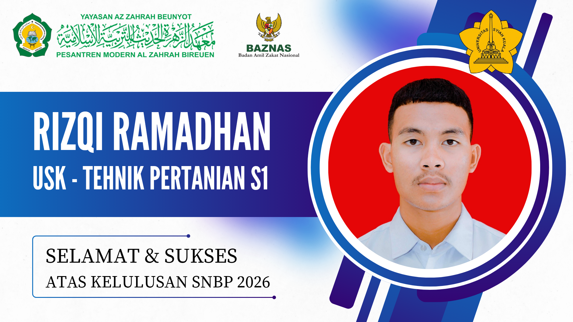 Bireuen – Kabar membanggakan kembali datang dari Pesantren Modern Al Zahrah Beunyot, Bireuen. Pada tahun 2026 ini, pesantren kembali mencatat prestasi gemilang dengan lolosnya empat santri melalui jalur Seleksi Nasional Berdasarkan Prestasi (SNBP) ke sejumlah Perguruan Tinggi Negeri (PTN) ternama di Aceh.