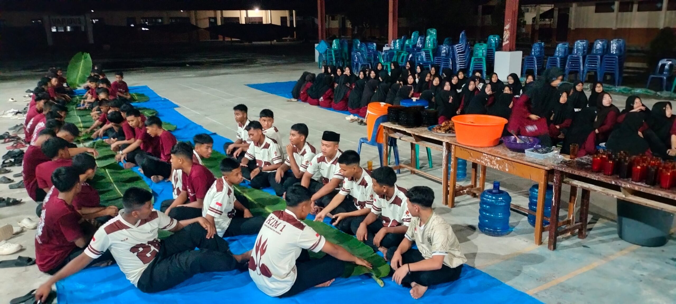 Satu per satu santri keluar dari kamar asrama menuju lokasi kegiatan. Sebagian terlihat sibuk menyiapkan hidangan ayam bakar di sudut aula, beberapa lainnya menggelar tikar serta menata meja, sementara mayoritas santri mengikuti rangkaian acara utama di ruang multimedia.